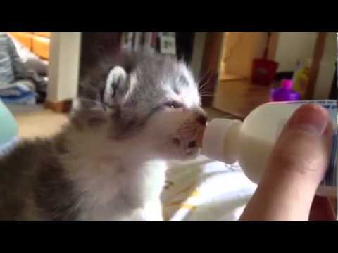Um gatinho incrivelmente bonito mexe as orelhas ao beber leite de uma garrafa!